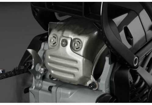 Глушитель имеет дополнительную переднюю защиту. Она предотвращает сгорание смолы, попадающей на бензопилу при пилении хвойных деревьев. Такая конструкция предотвращает вдыхание оператором продуктов горения смолы во время работы.