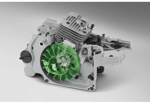 Вихревой поток, создаваемый цельнолитым маховиком увеличенного размера с широкими лопастями особой формы, принудительно подается на ребра охлаждения цилиндра, удаляя с них загрязнения. При этом крупные и тяжёлые частицы в воздухе выбрасываются наружу, а очищенный воздух направляется к фильтру. Такая эффективная система охлаждения защищает двигатель от перегрева, увеличивает его ресурс и межсервисный интервал.