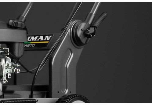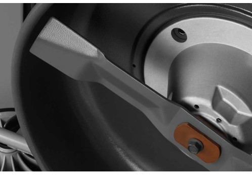 Мощные быстросъемные алюминиевые зажимы позволяют быстро отрегулировать положение рукоятки под любого оператора, сохраняя при этом жесткость конструкции. Рукоятка соединена с корпусом газонокосилки с помощью мощного стального кронштейна, который эффективно снижает вибрацию и повышает срок службы узла.