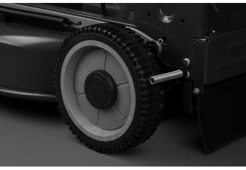 Колеса на двойных шарикоподшипниках в закрытой обойме имеют длительный срок службы. Стальные пружинные скребки удаляют мульчу с протектора и не оставляют комки травы во время скашивания.