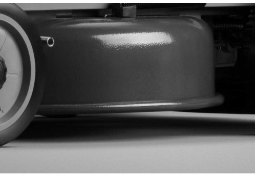 На деку газонокосилки нанесено специальное ударопрочное покрытие. Каждый из трех слоев краски – базовый, с молотковым эффектом, финишный лак – проходит процесс обжига для плавления и полимеризации материала. Такое покрытие прочнее, чем стандартная покраска. Благодаря этому косилка надежно защищена от царапин, ударов и влажности.