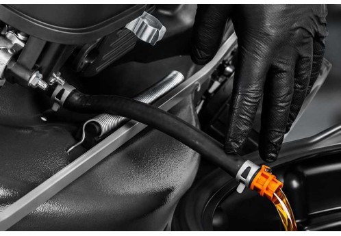 В отличие от традиционных моторов для газонокосилок, где смазка осуществляется разбрызгиванием, система смазки под давлением позволяет эффективнее охлаждать мотор при длительных нагрузках, а также работать на склонах до 20 градусов (35%) без риска масляного голодания или перегрева. Масляный фильтр также способствует увеличению срока службы, поскольку масло постоянно очищается от продуктов износа.