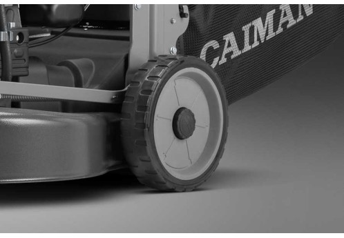 Привод на задние колеса газонокосилки осуществляется посредством полноценной 3-скоростной карданной передачи Shaft Drive. Корпус выполнен из высококачественного алюминия, а все внутренние приводные компоненты изготовлены из закаленной стали. Карданная передача имеет минимальные потери мощности, не требует чистки от травы и периодической замены ремня как традиционные передачи. Подобная конструкция снижает время простоя и повышает производительность. Она облегчает работу оператора на газоне, склонах или неровных участках. Ресурс механической коробки передач на порядок выше, чем у стандартного редуктора CAIMAN. Рычаги управления скоростью движения удобно расположены на рукоятке газонокосилки.
