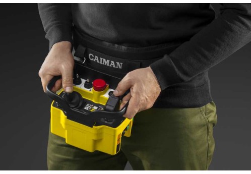 Управление машиной CAIMAN Commando осуществляется с помощью пульта радиоуправления. Для освоения навыков управления машиной не требуется долгое обучение. Профессиональные джойстики позволяют предельно точно управлять машиной на безопасном расстоянии до 200 метров вдали от шума, пыли и выхлопных газов. Устройство крепится к поясу оператора с помощью удобной эргономической подвески. Отличается высокой степенью защиты: радиоуправление устойчиво к перепадам напряжения, ударопрочный корпус защищен от влаги и пыли, степень защиты IP65.