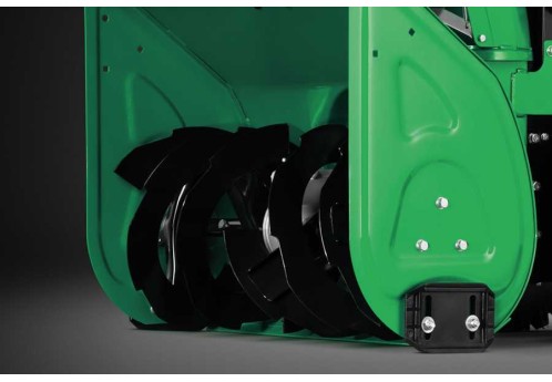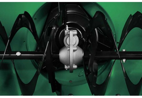 Ленточный шнек выполнен из высококачественной легированной стали, смонтирован на осях, установленных в шариковые подшипники. Снежная масса, захватываемая шнеком, смешивается с воздухом. Это значительно облегчает снег, подаваемый на крыльчатку двигателя, где он разбивается на мелкие фракции, а затем через дефлектор с ускорением отбрасывается на расстояние до 12 метров.
