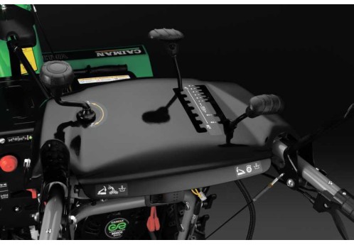 Панель управления выполнена из металла. Это обеспечивает высокий уровень прочности. Все элементы управления выведены на панель управления и легко доступны. Рычаги и переключатели, при помощи которых можно сменить передачу, отрегулировать поворот желоба выброса и угол наклона дефлектора, включить или выключить фары, активировать самоход или шнек, находятся под рукой оператора.